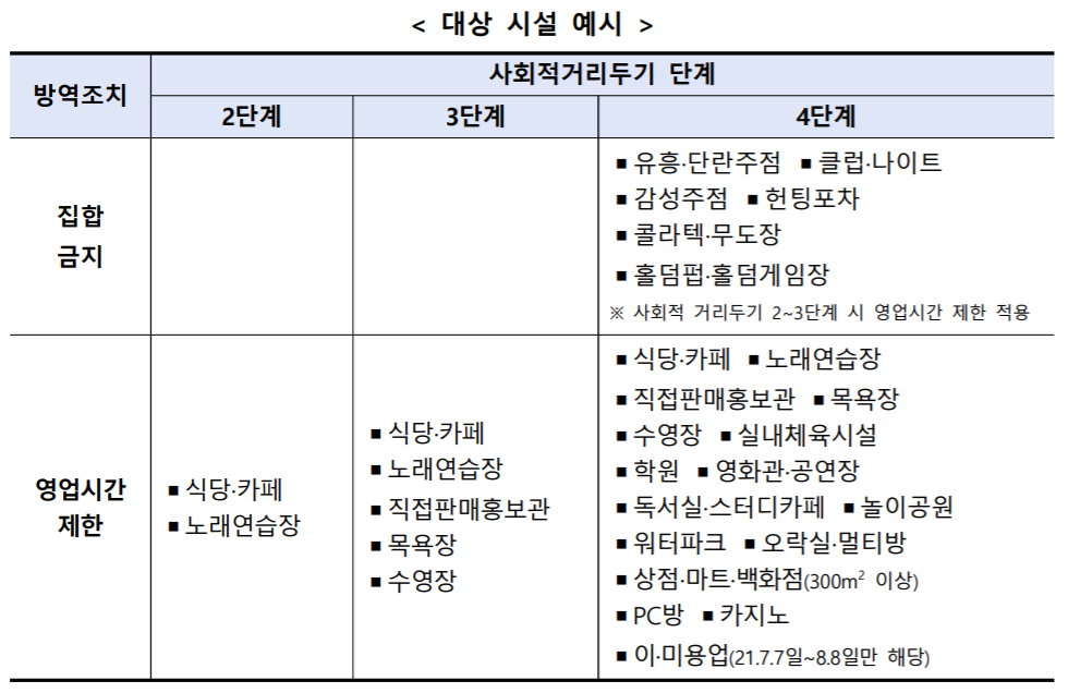 (예시) 면적당 인원 제한, 수용인원 제한, 시설 일부 사용 제한, 사적 모임 제한, 다중이용시설 기본 방역수칙 등